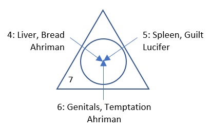 Then imagine the spleen as Lucifer’s domain and the liver as Ahriman’s realm in the human body. Then two living lines proceed from the fourth and fifth petitions, to the centre of the 8 petalled lotus, i.e., to the centre of the triangle.